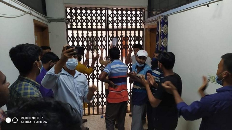 তাদের অবরুদ্ধ করে বাইরে থেকে স্লোগান দিচ্ছেন আন্দোলনরত কর্মচারীরা।